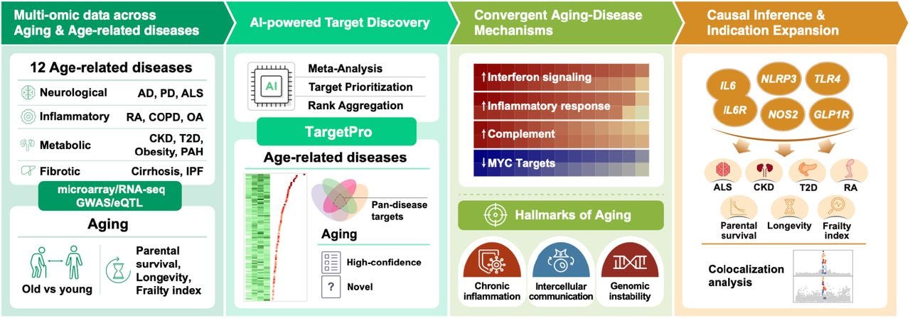 An AI-driven multi-omic framework from Insilico Medicine used Mendelian randomization across 12 age-related diseases and found causal genetic support for the GLP-1 receptor in aging-related traits: alongside IL6, IL6R, NLRP3, and TLR4. Chronic inflammation was the #1 enriched hallmark. Separately, Harvard reported GLP-1s showing 40% relative risk reduction in heart failure with preserved ejection fraction.