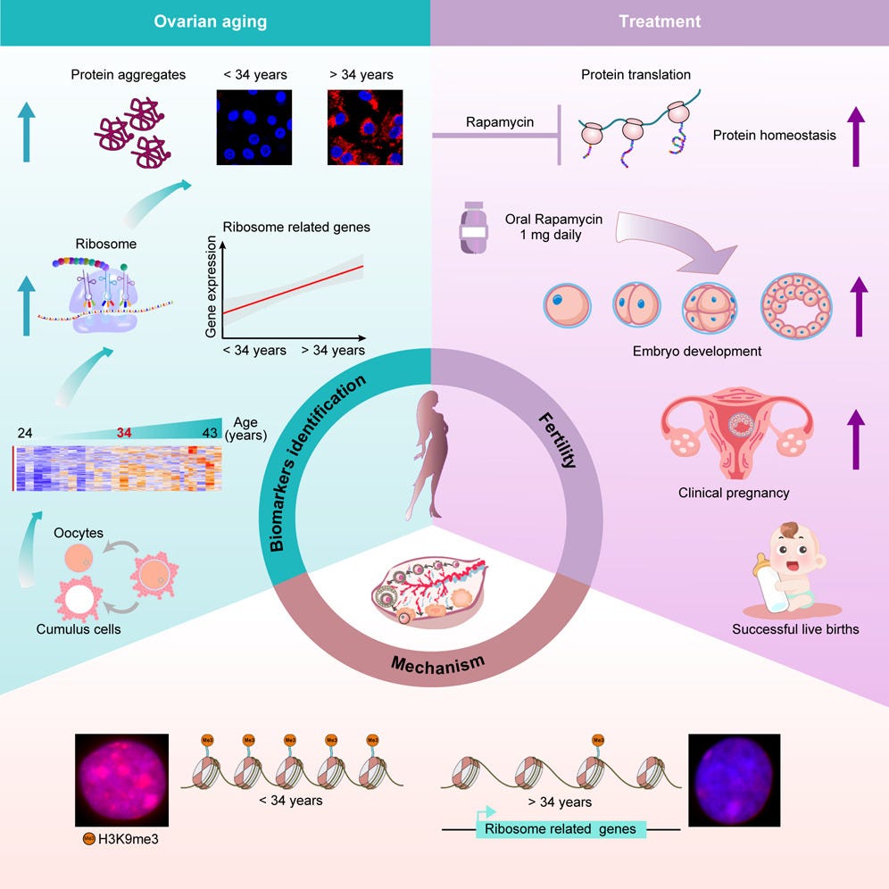 These data suggest a causal role for elevated transcription of ribosome genes in aging oocytes and cumulus cells and identify rapamycin as a promising treatment for age-related infertility. Cell Reports Medicine