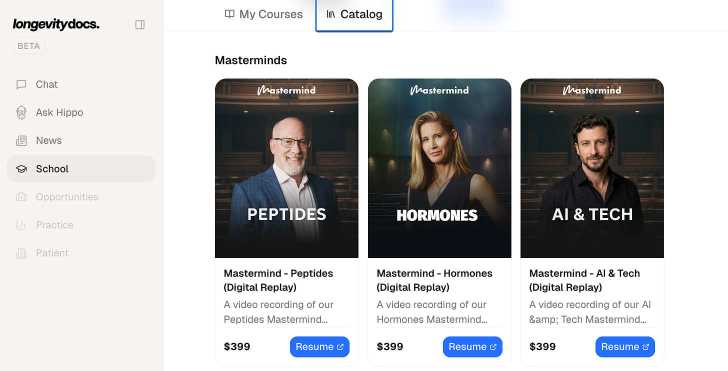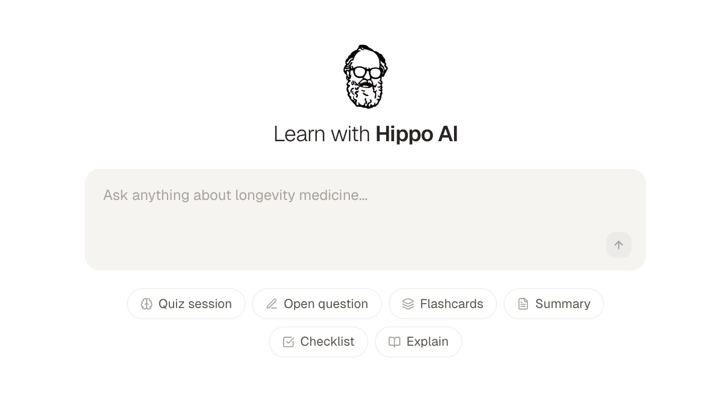 Hippo: A learning assistant trained on our certification curriculum. Ask anything about longevity medicine and get an answer grounded in the science we’ve built together. Available to all members. Fully unlocked for CLDs (this is not a Clinical Decision Support)