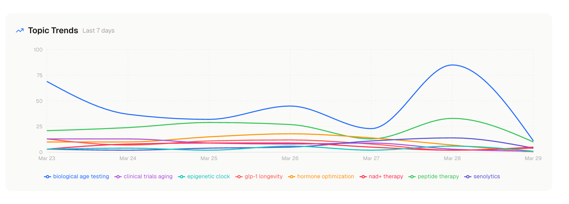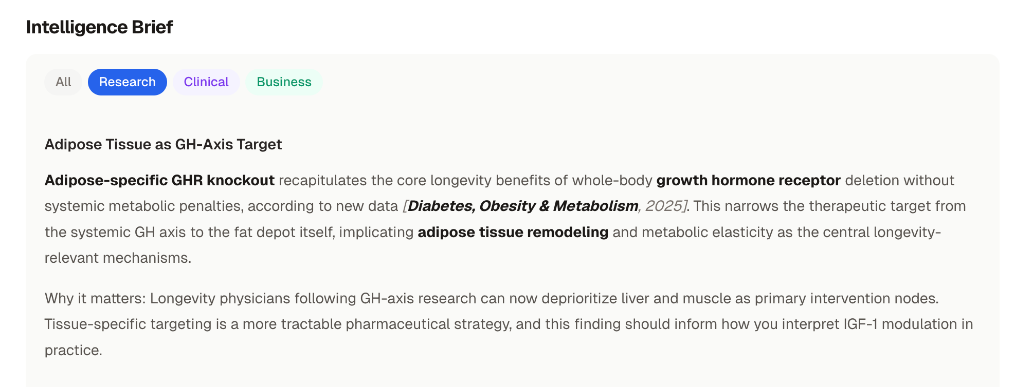 Intelligence Brief: Daily synthesis of what matters (PubMed, journals, media) filtered through a longevity medicine lens and organized by Research, Clinical, and Business. All intelligence in one place