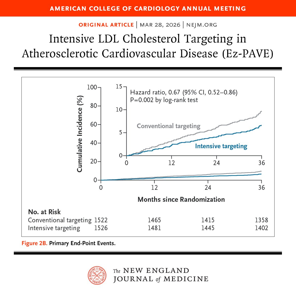 Among patients with atherosclerotic cardiovascular disease, targeting an LDL cholesterol level below 55 mg per deciliter led to a lower 3-year risk of cardiovascular events than targeting a level below 70 mg per deciliter. Full Ez-PAVE trial results: NEMJ