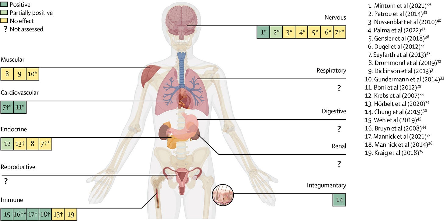 Lancet Healthy Longevity systematic review (Feb 2024) analyzed 19 human studies from 18,400 screened articles on rapamycin and rapalogs for aging. Findings: improved physiological parameters in immune, cardiovascular, and integumentary (skin) systems. No significant effects detected in endocrine, muscular, or neurological systems. Respiratory, digestive, renal, and reproductive systems not assessed. Notably, no clear dose-response relationship emerged across studies, suggesting optimal dosing protocols remain undefined.