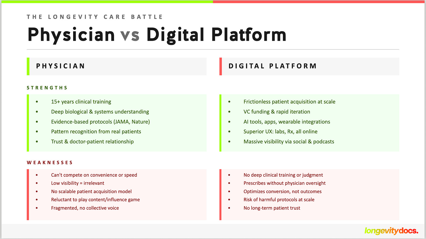 The battle for longevity medicine has begun. On one side: digital platforms armed with venture capital, AI tools, and frictionless patient acquisition. On the other: physicians with 15 years of training, deep clinical knowledge, and a growing sense they’re being outflanked by apps and influencers.