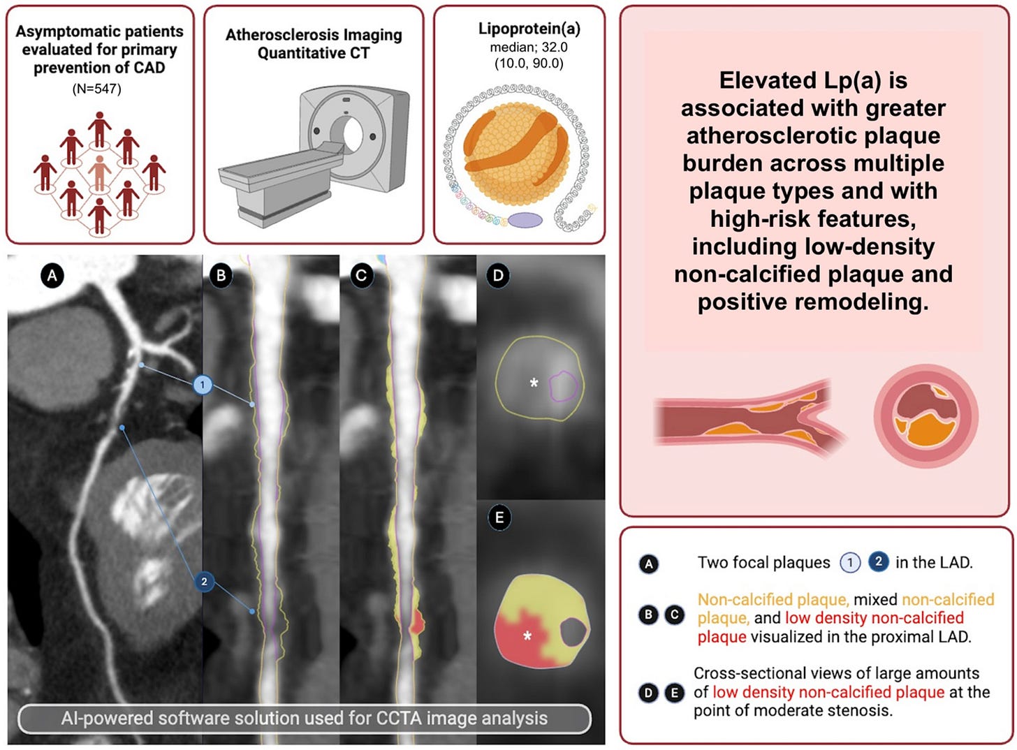 European Heart Journal imaging study (Fisher et al., Jan 28, 2026) analyzed 547 asymptomatic primary prevention patients with AI-guided quantitative coronary CTA. Elevated Lp(a) independently associated with low-density non-calcified plaque (LDNCP) -the vulnerable phenotype most likely to rupture- even after adjusting for age, sex, and other risk markers. CAC score predicted overall plaque burden and calcified plaque (P < 0.000) but showed no association with LDNCP. LDL-P and hsCRP showed no significant plaque associations in multivariable models.