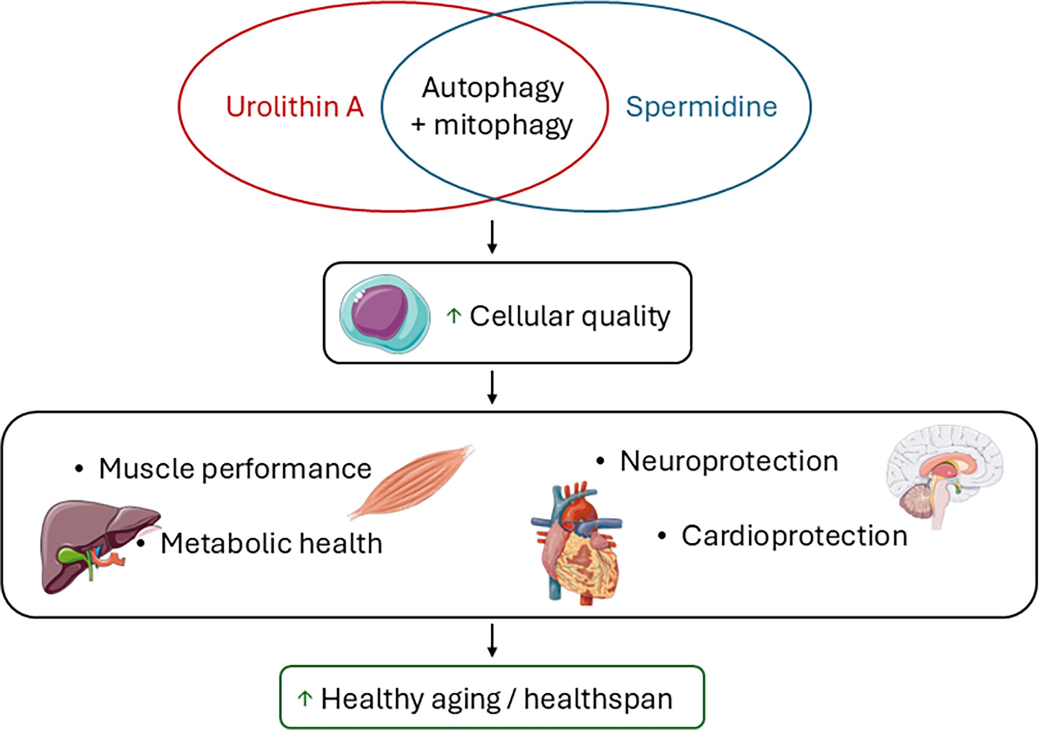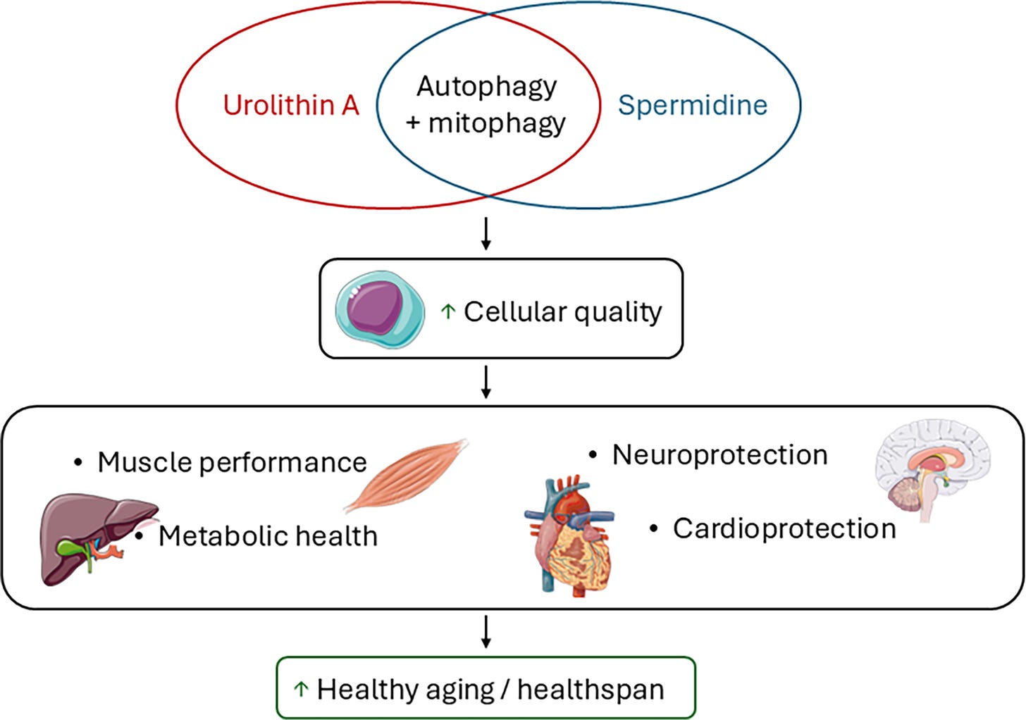 For longevitydocs: For patients focused on mitochondrial dysfunction (sarcopenia, heart failure, or metabolic disease with confirmed mitochondrial impairment) urolithin A may be the more targeted choice. Spermidine offers broader cellular maintenance but less specific mitochondrial benefit.