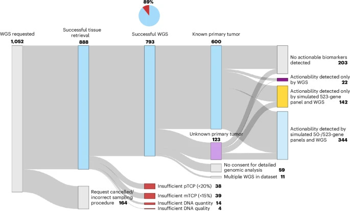 In a real-world study of 888 solid cancer patients, whole-genome sequencing (WGS) succeeded in 89% of cases with a median turnaround of 6 working days, identifying actionable biomarkers in 73% of patients. Those who received biomarker-informed treatment lived a median of 96 days longer than those who did not. WGS was especially impactful in cancers of unknown primary, contributing to diagnosis or treatment options in 67% of cases. Overall, WGS-based diagnostics had meaningful clinical consequences for 41% of all patients tested, making a strong case for its routine use in oncology. Nature Medicine