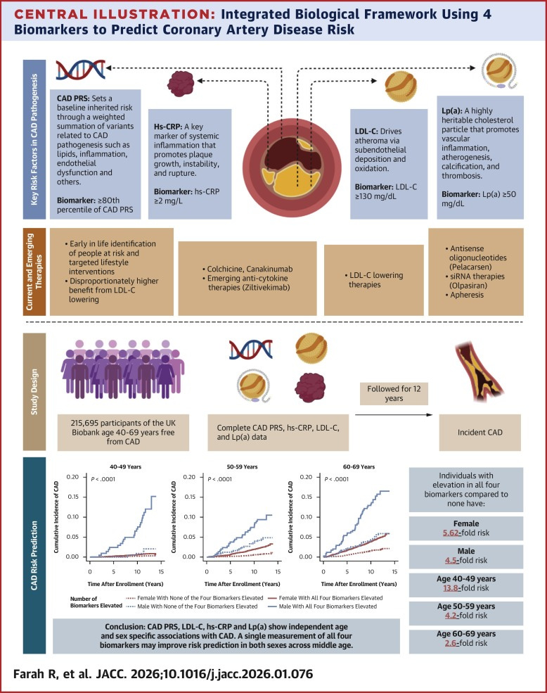 A JACC study found that a single midlife measurement of CAD polygenic risk score, hsCRP, LDL-C, and Lp(a) predicts future coronary artery disease across both sexes and ages 40 to 69. It matches traditional clinical risk calculators while catching patients those calculators miss entirely. Most of your patients walk in with at least two of these already run. This gives you clinical justification to systematize all four as a standard longevity panel at first visit, especially in patients in their 40s where biomarker-based screening outperforms conventional tools the most. JACC