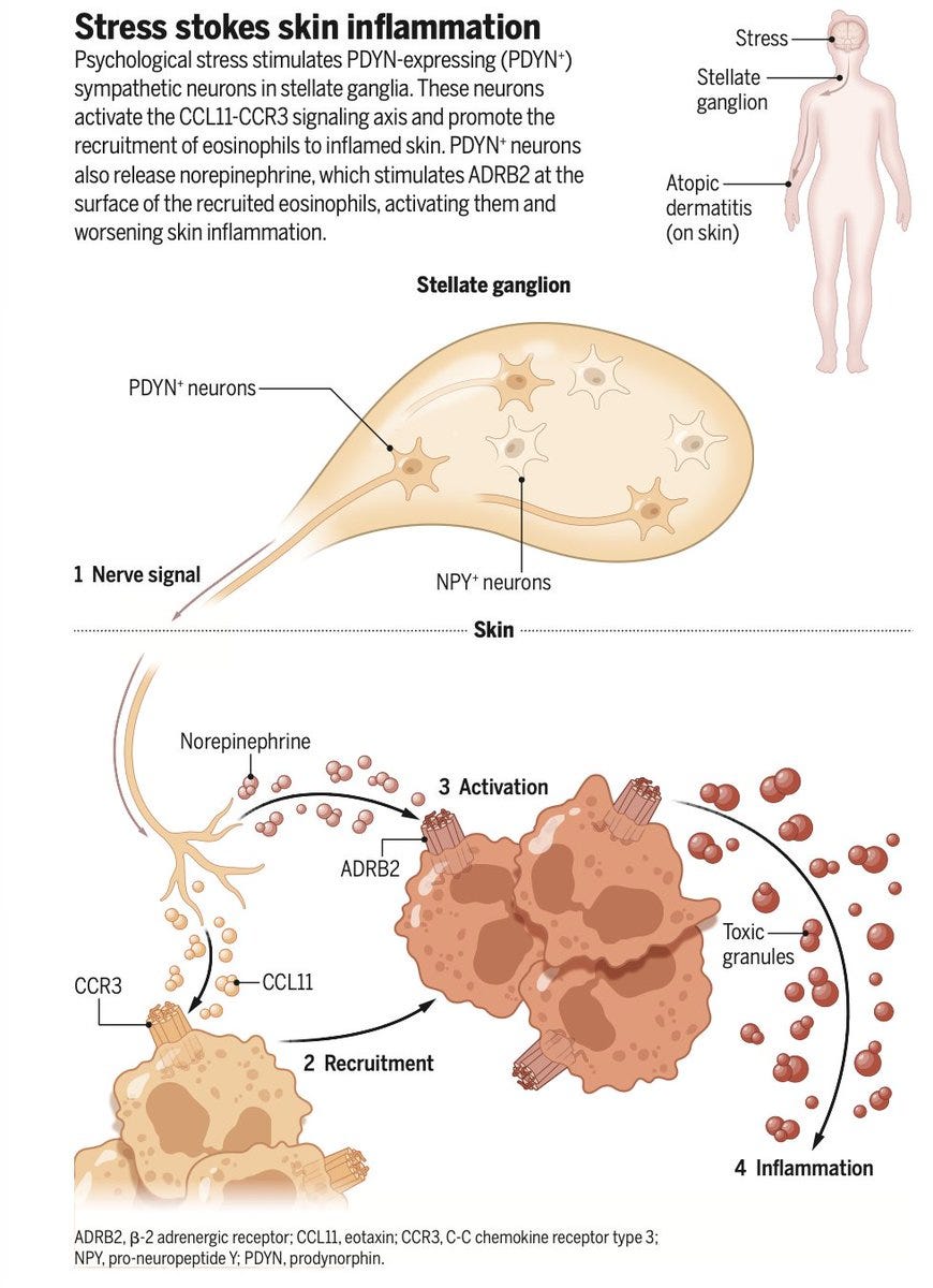 A new study identified a specific population of norepinephrine-producing sympathetic neurons that directly innervate the skin and drive stress-induced flares of atopic dermatitis in mice via an eosinophil-dependent pathway. This is the first dedicated neuroimmune axis mapped between psychological stress and skin inflammation at this level of precision — and it opens the door to targeted interventions that block the neural pathway rather than broadly suppressing the immune response. For physicians managing patients with stress-related skin conditions, "reduce stress" is finally getting a clinical mechanism behind it. Science