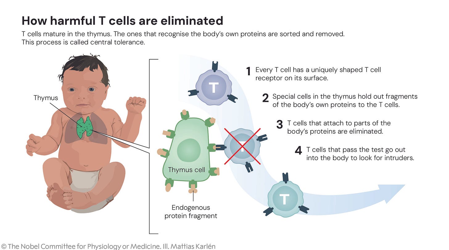 Researchers long believed they knew the answer to these questions: that immune cells mature through a process called central immune tolerance (see image). However, our immune system turned out to be more complex than they believed. Mary Brunkow, Fred Ramsdell and Shimon Sakaguchi have been awarded the 2025 Nobel Prize in Physiology or Medicine for their discoveries concerning peripheral immune tolerance. CNN