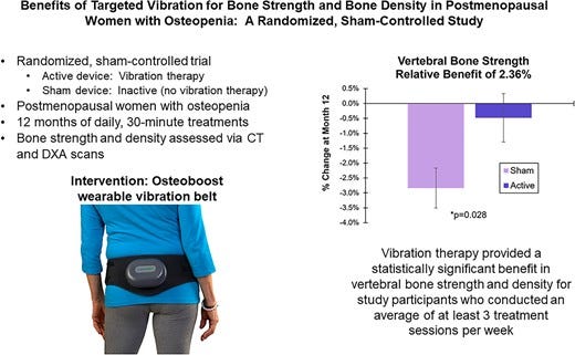 The vibration therapy was well-tolerated, and there were no serious device-related adverse events. These results demonstrate that targeted vibration is safe and, in adherent individuals, can significantly mitigate the decline in vertebral bone strength and vertebral bone density in postmenopausal women with osteopenia. JBMR